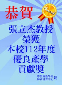 恭賀!本所暨師培中心張立杰教授榮獲本校112年度優良產學貢獻獎